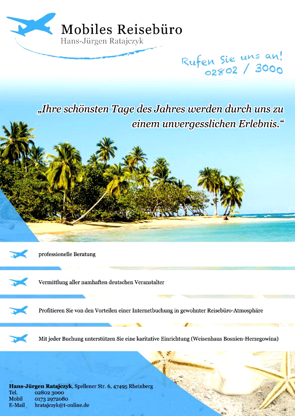 Eine Reise beginnt immer mit einer guten Beratung Bei uns buchen Sie nicht anonym im internet und landen anschließend im irgendwelchen Callcenter am anderen Ende der Welt, sondern bei einem Fachmann vor Ort in Rheinberg-Wallach. Sie provotieren von den Vorteilen einer Internetbuchung, müssen abernicht auf den gewohnten Reisebüro-Service verzichten. Wir vermitteln Ihnen alle bekannten und alle namhaften Veranstalter: